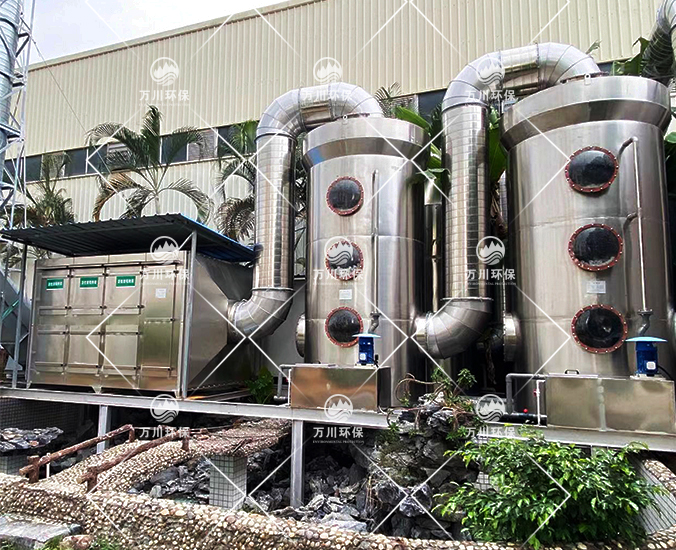 根據(jù)客戶需求和我司實(shí)地考察之后,最終采用‘兩級噴淋吸收法+活性炭吸附法’對其進(jìn)行處理。采用水噴淋一方面可以降溫,另一位方面能夠讓水吸一部分的有機(jī)廢氣,降低后續(xù)活性炭吸附的負(fù)荷。